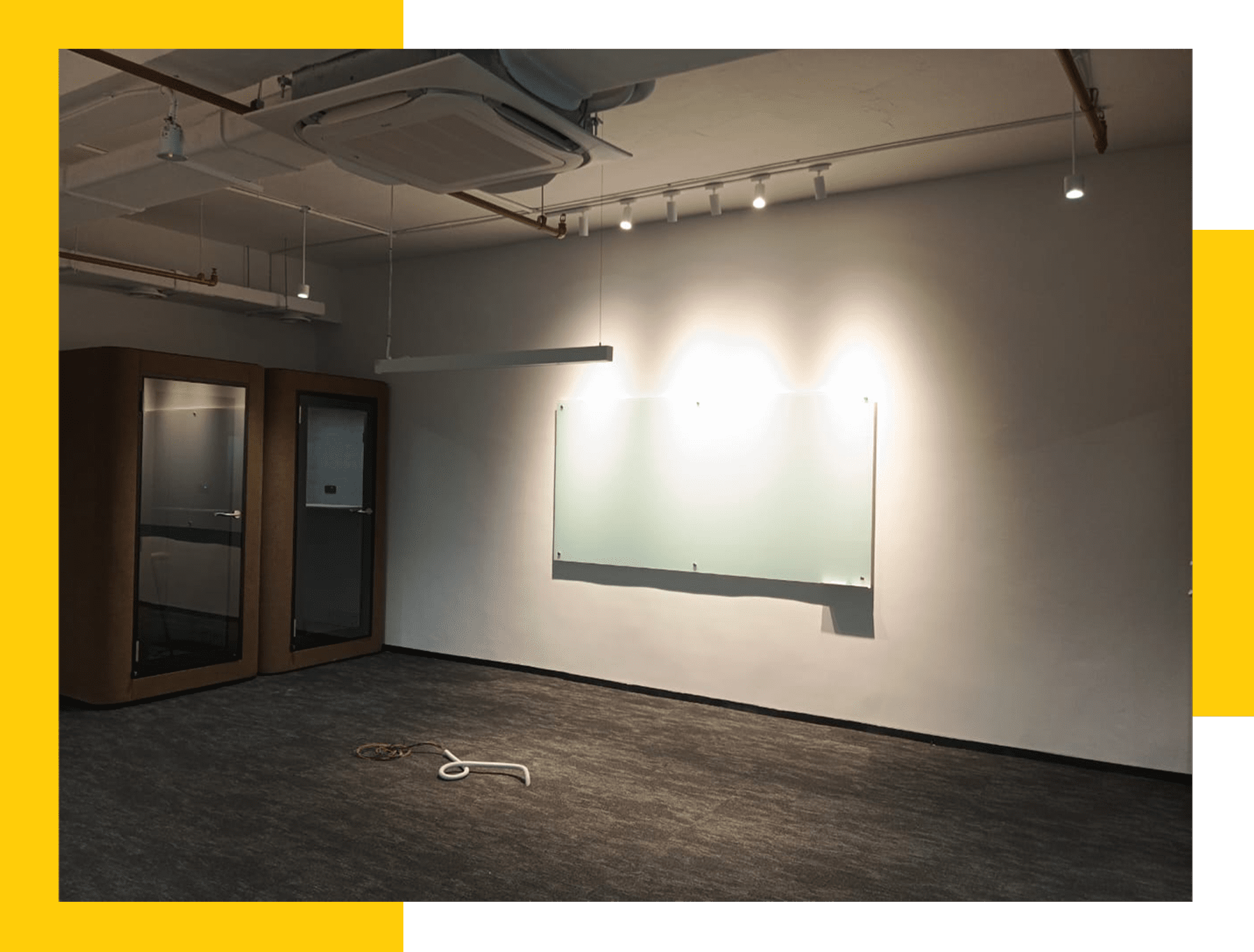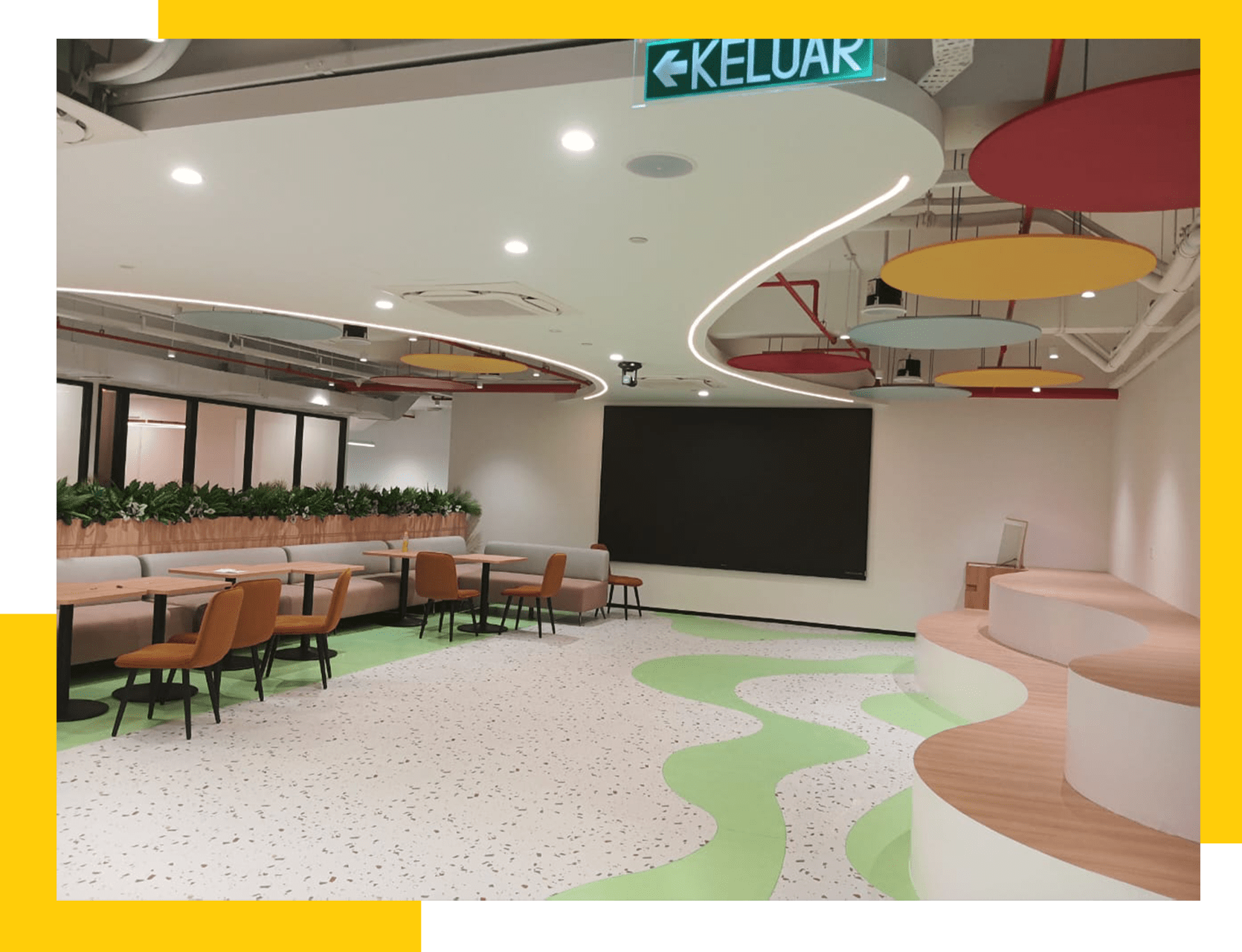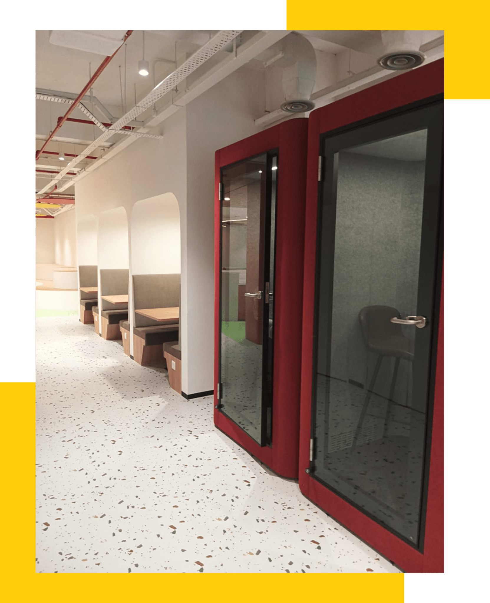 In the public areas and open collaboration zones where brand vitality is most evident, the lighting design engages in a deep dialogue with interior aesthetics. Red, yellow, blue, and green circular acoustic panels are suspended across the ceiling in a well-spaced arrangement, paired with minimalist pendant downlights to solve acoustic issues while creating a rich visual hierarchy. Green wave patterns on the floor echo the curved linear lighting systems embedded in the ceiling, skillfully guiding traffic flow and connecting various discussion blocks. To meet needs for focus and privacy, vibrant red soundproof phone booths were installed, featuring soft internal lighting that ensures a high-quality environment for calls while remaining perfectly unified with the brand’s visual identity.