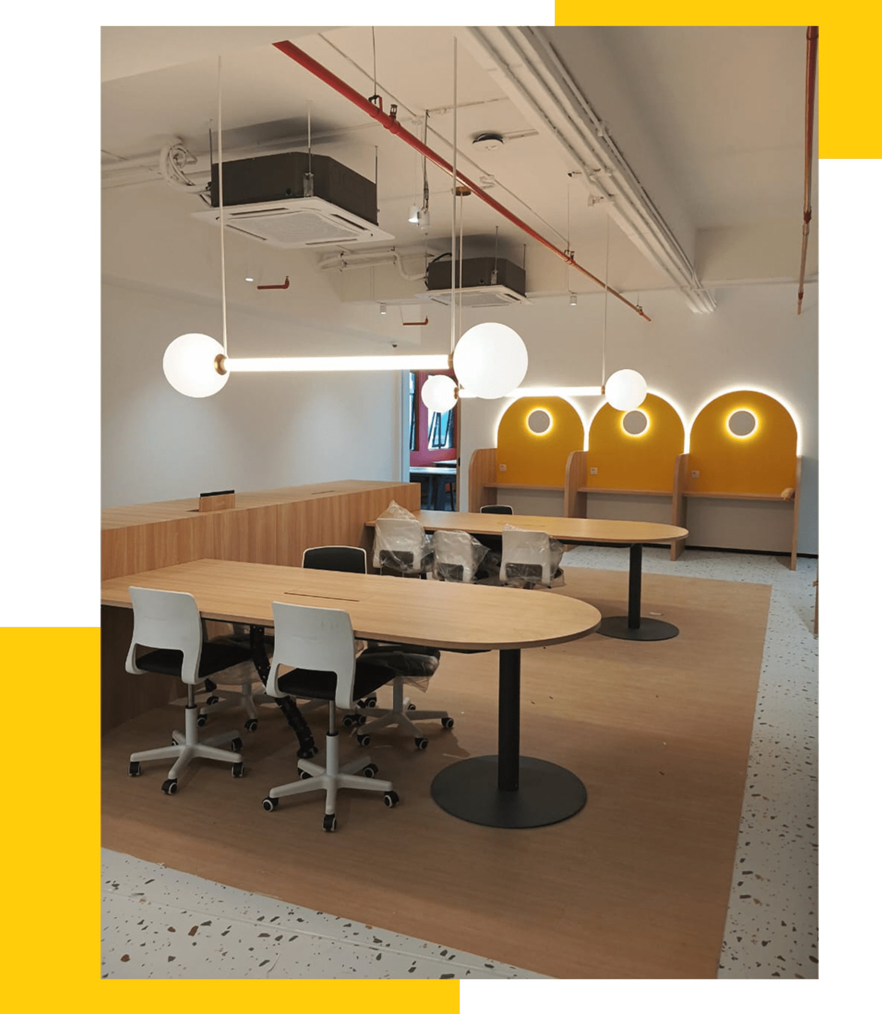For the large-scale open office areas, the design team chose a solution combining modern industrial style with high-performance illumination. Slimline linear pendants are arranged at precise intervals above workstations; their clean white bodies create a striking visual contrast with the exposed ceiling pipes and red fire protection systems. This configuration ensures sufficient and uniform task lighting for every desk, significantly enhancing employee visual comfort while using the linear extension of the fixtures to increase the overall sense of openness in the office. Even in window areas with abundant natural light, artificial sources balance ambient brightness to ensure a stable and professional lighting environment under any weather conditions.