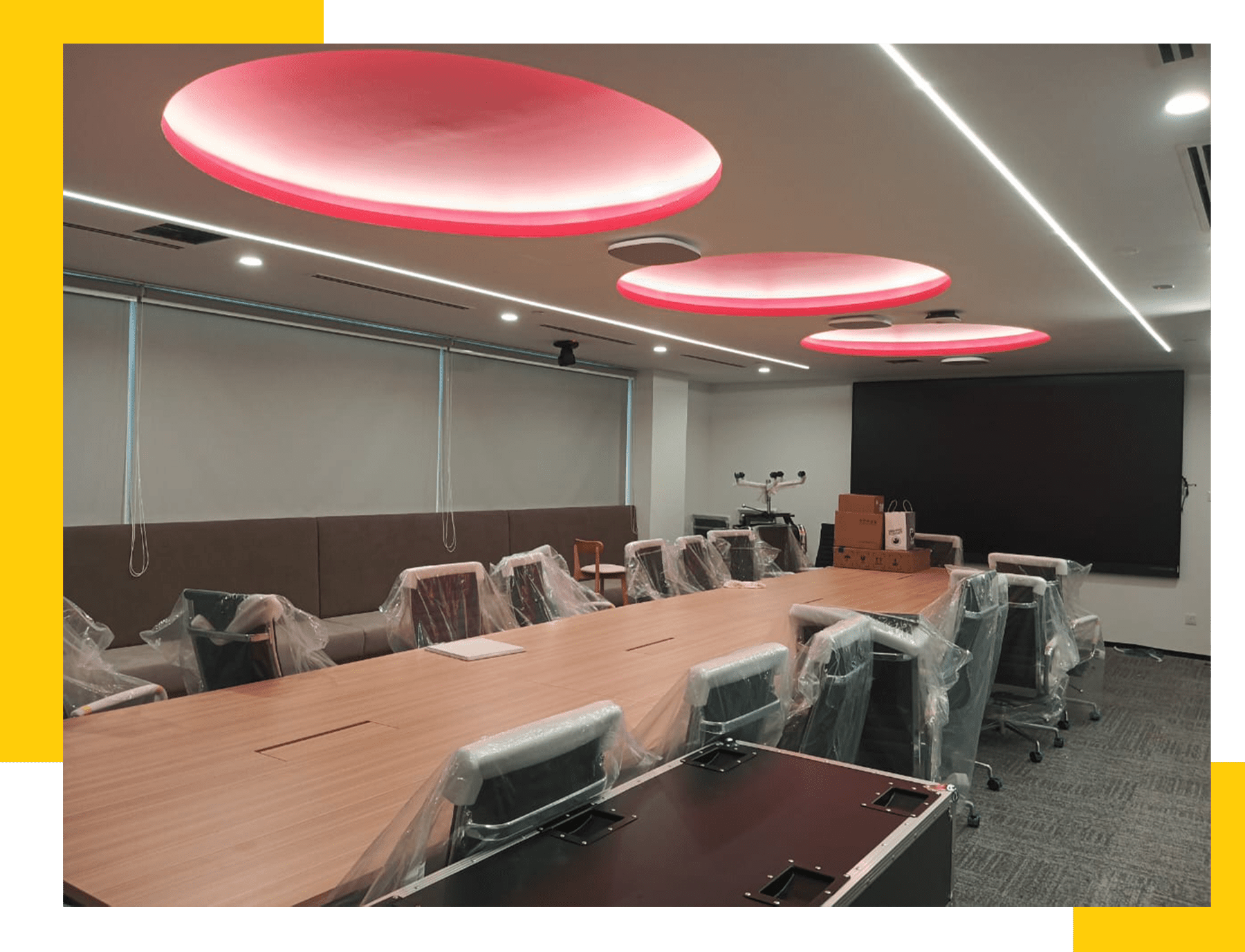 In executive offices and formal conference rooms, the lighting design shifts toward a pursuit of sophisticated layering and prestige. Formal boardrooms feature golden ring chandeliers as a visual centerpiece, with hidden LED strips embedded within red circular ceiling motifs to create an elegant indirect glow symbolizing corporate cohesion. Executive offices skillfully combine Perform recessed downlights with wooden ceilings and professional aluminum profile light strips within shelving units to create a delicate luminous texture that serves both a display function and adds warmth to the space. Additionally, specific discussion areas utilize contemporary globe pendants and backlit decorative walls, elevating the lighting system to the level of spatial installation art.